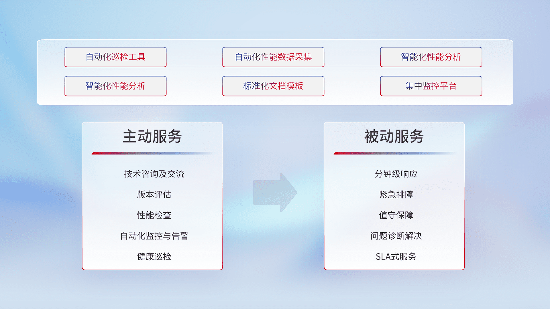 智能化工具和标准化文档,,保障服务质量,,提供主动服务(包含技术咨询、、、版本评估、、性能检查、、、自动化监控与告警、、、健康巡检)和被动服务包含(分钟级响应、、紧急排障、、值守保障、、、问题诊断解决、、、、SLA服务)。。。